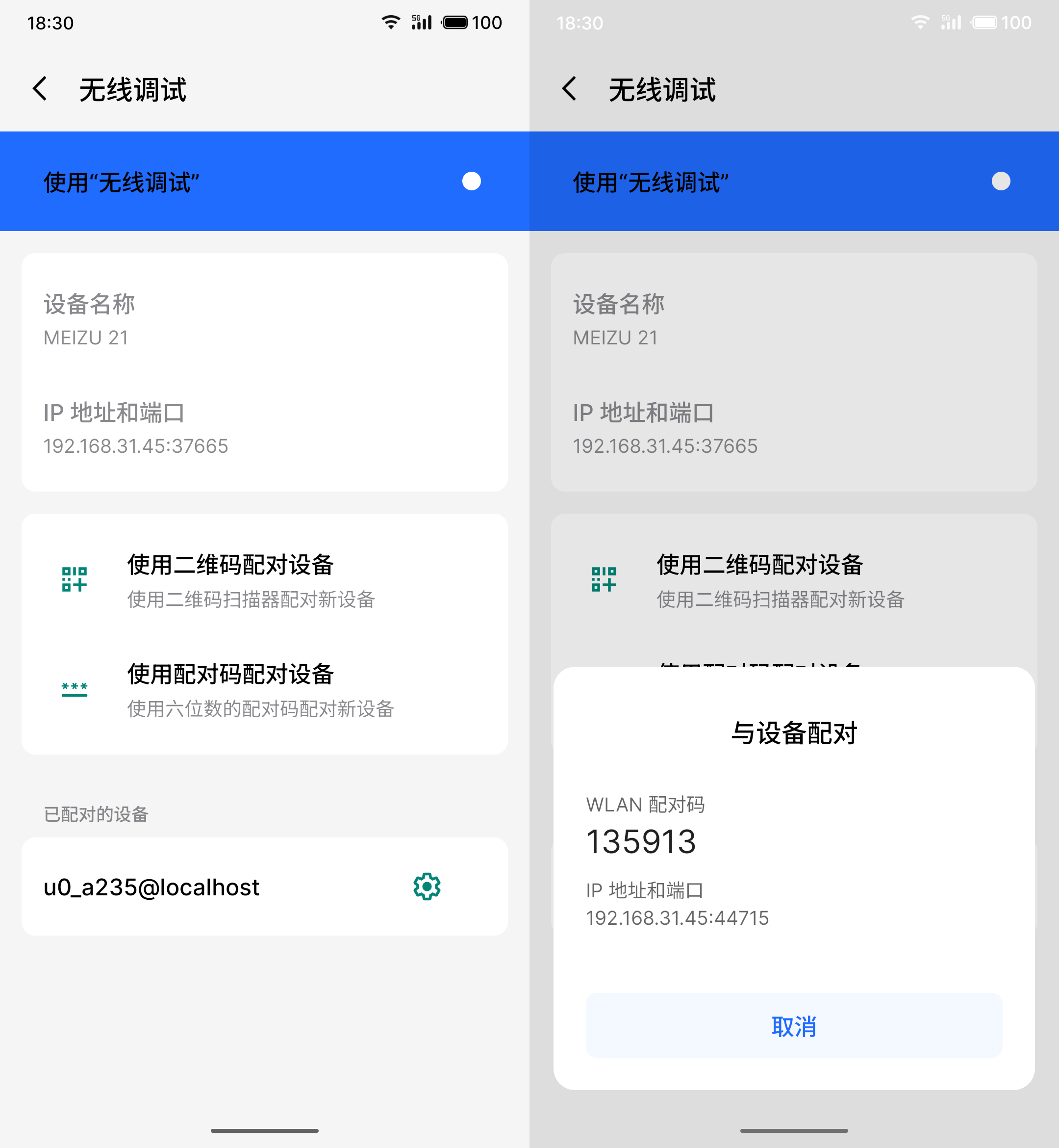 注意这儿是控制端打开,与开启远程调试打开弹窗的不是同一个手机(除非自己连自己)